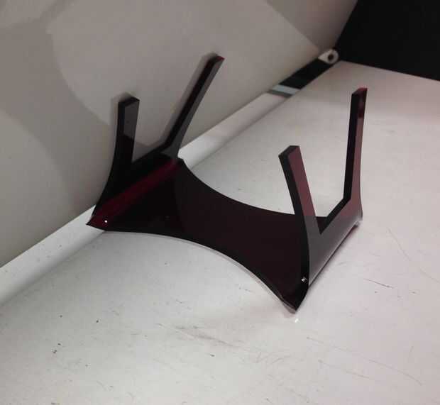 Un calentador de tira de acrílico genera una línea de aire caliente que localmente se calentar y ablandar el acrílico para doblar.  La hoja de acrílico plegable herramienta puede ser colocada y asegurada en su lugar para que el acrílico se puede doblar a un ángulo específico.  Para este soporte Ajuste el ángulo de 105 grados (de modo que los extremos se dobla ligeramente sobre sí mismas).  Alinee el primer extremo del titular sobre la abertura de aire caliente, y después de unos minutos el acrílico será lo suficientemente suave como para doblar. Doble el extremo para arriba parcialmente a mano y luego presione el soporte en la herramienta plegable.  Mántengalo en esa posición durante unos minutos permitir que el acrílico se enfríe y coloque en posición.  Repita el mismo calor y doble proceso en el otro extremo.