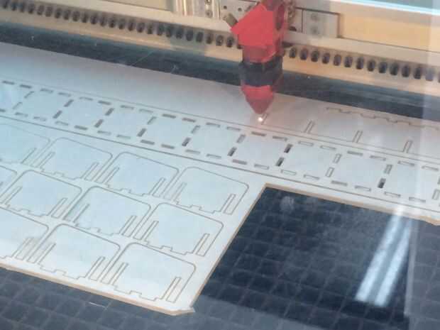 Antes de usar el lasercutter, he modificado mi dibujo final para tener en cuenta el corte del haz láser. Ensayo y error, combinado con la línea de investigación reveló que usando un desplazamiento de 1/16 de pulgada en los lados de las ranuras permite para el ajuste perfecto. Una vez que se ajustan todas las ranuras, ejecute el archivo.
