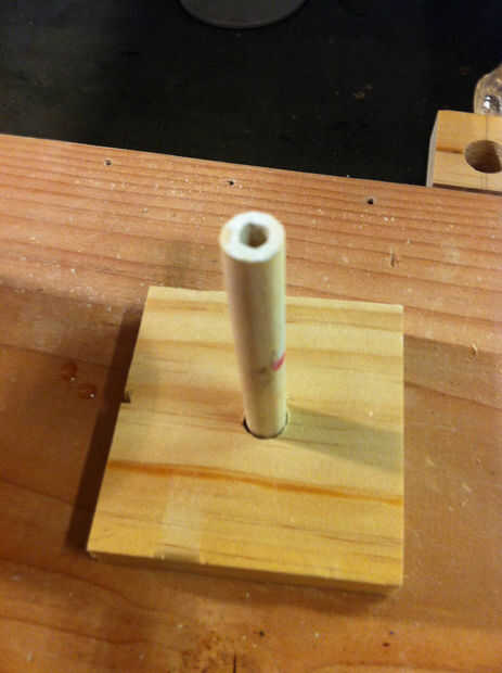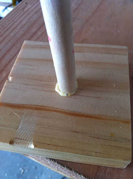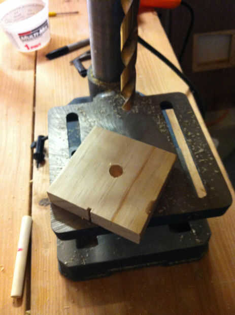 empecé con la base. Tuve un square-ish bloque de madera de desecho que queda de otro proyecto. También tenía un mango de un pincel de espuma barata. Perforó un agujero ligeramente más grande que el mango y me iba a la mitad con mi taladro. La manija de ajuste un poco flojo pero que está bien. Pongo algunos Titebond en el agujero, lo suficientemente que llenaría el espacio cuando entró en el mango y deje que se seque durante la noche.