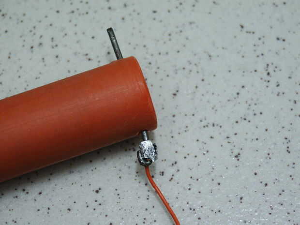 Tomar el trozo de alambre y cortarlo para que pase a través de los agujeros taladrados en el tubo y sobresale aproximadamente una pulgada a un lado. Tira de 1/4 de pulgada del aislamiento de los otros cables eléctricos y envolver la parte pelada de cable eléctrico alrededor del extremo de su cable (uno que sólo se corta) cerca de 1/4 pulgada lejos el final. Cortar un trozo de 1/2 por 1/8 pulgada de aluminio chatarra y Envuélvala alrededor de la eléctrica de alambre y alambre y apriete firmemente con las pinzas. Luego doblar el extremo del cable de 1/4 de pulgada de eso y aprete