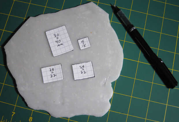 -Dibujar estos cuadrados en papel (o imprimirlos si tiene un programa de gráficos que le permite hacer esto con precisión.) Recorto y utilizarlos como plantillas para trazar las piezas en el plástico.