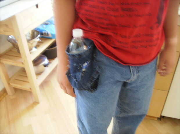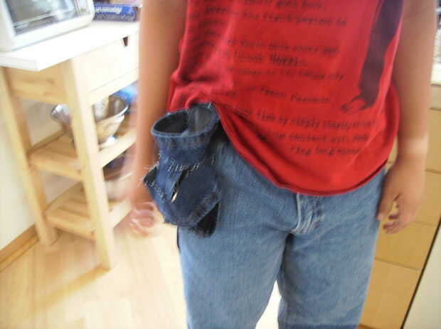 hecha de retazos de mezclilla de mi mamá, dobladillar los puños de las bragas de mi hermanito. Muy simple, pero la dificultad depende en qué material utilizas. Podría ser más sencillo utilizar una pierna del pantalón, pero no tenemos una colocación alrededor ni nada.
