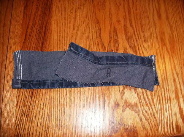 Obtener otro rectángulo de material, algo más corto que la llamada de A. que "B". Si se va a pegarse un extremo de la A y uno de B para que se solapen (traslapo les de la manera que usted cose les juntos más adelante). El otro extremo de la A debe ser en el mismo lugar que el otro extremo de B, y usted debería ser capaz de poner una botella de agua entre ellos con facilidad. Si no, haz un pedazo largo de material y cambiar "B" con él. Llame esta pieza más larga del material "B".