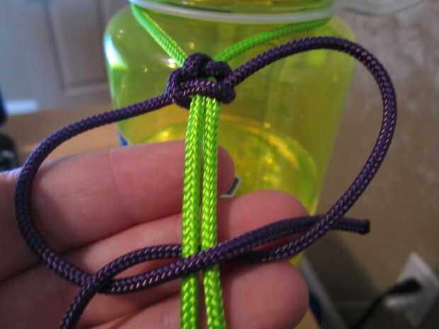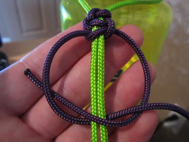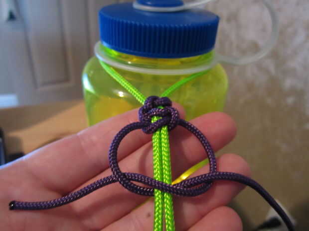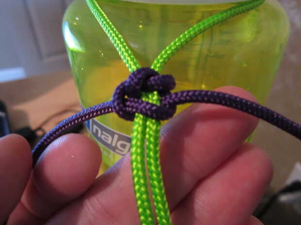 Empezar haciendo un nudo simple, asegurándose de que ambos lado son longitudes incluso, tomar el lado izquierdo detrás de la cuerda que va alrededor del cuello de botellas. Ahora tomar el lado derecho debajo o detrás de la pieza izquierda, entonces sobre la pieza verde (en este caso) y a través del lazo en el otro lado. Ahora tire de ambos lados hasta que estén bien apretados en la parte superior. Así que ahora usted está va a repetirlo desde la dirección opuesta. Tomando el lado derecho y vaya detrás de la fabricación verde un lazo y luego tomar el lado izquierdo ir detrás de la pieza de la derecha, luego sobre el verde y a través del lazo. Llevar apretada contra la armadura anterior. Seguir haciendo esto hasta llegar a 3" de la parte inferior.