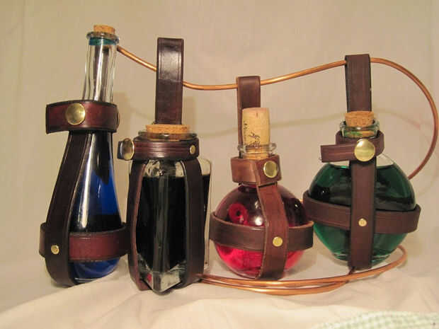 Cada aventurero valiente necesita llevar líquidos y componentes con él. ¿Qué mejor manera que en una botella de poción de vidrio con un soporte de cuero hechos a mano?