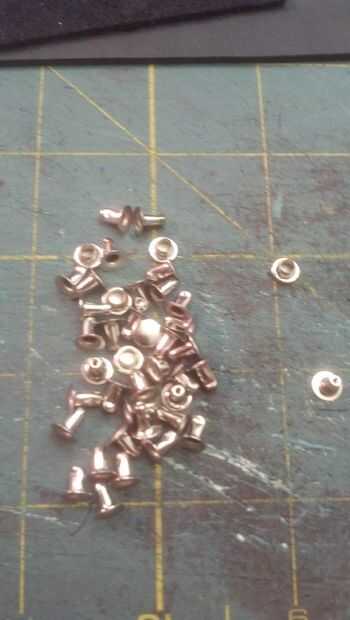 Podrá también la necesidad de obtener algunos remaches y broches de presión en el Tandy. Los remaches son unos $5 para un paquete de 100 remaches vienen en diferentes longitudes y el tamaño de remache que usted necesita se determina por el grosor de su piel. Mi piel no demasiado gruesa, por lo que estoy usando el tamaño pequeño. Usted también necesitará algunas instantáneas y un setter, aquí.