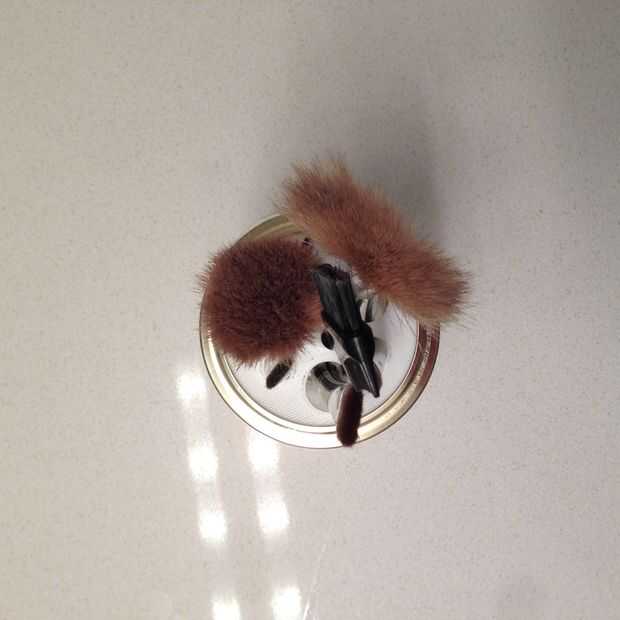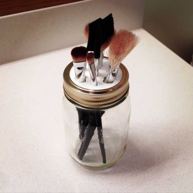 Paso 1: Reunir los materiales • Un tarro de masón• Tantos pinceles de maquillaje como usted deseaPaso 2: Unirlo Primero, desenrosque la tapa y saque la pieza superior real. Luego vuelva a enroscar el borde de metal y lanzar tus pinceles de maquillaje