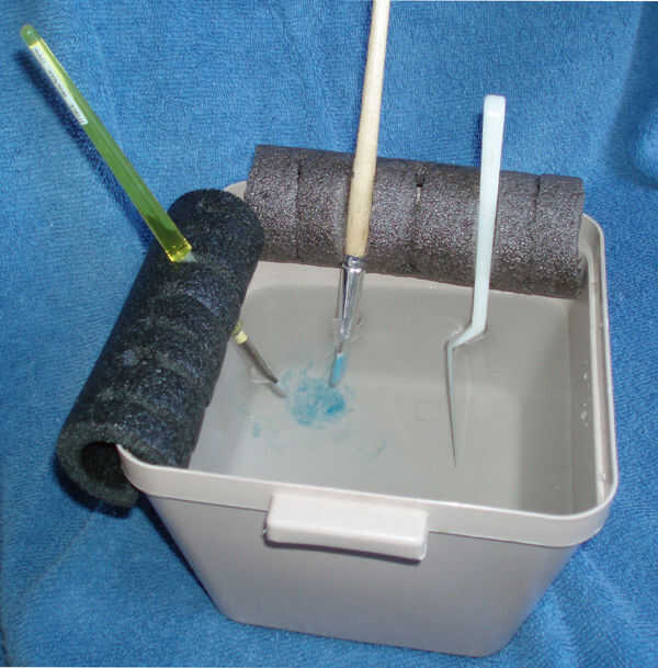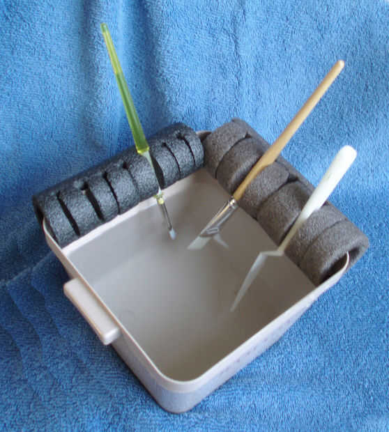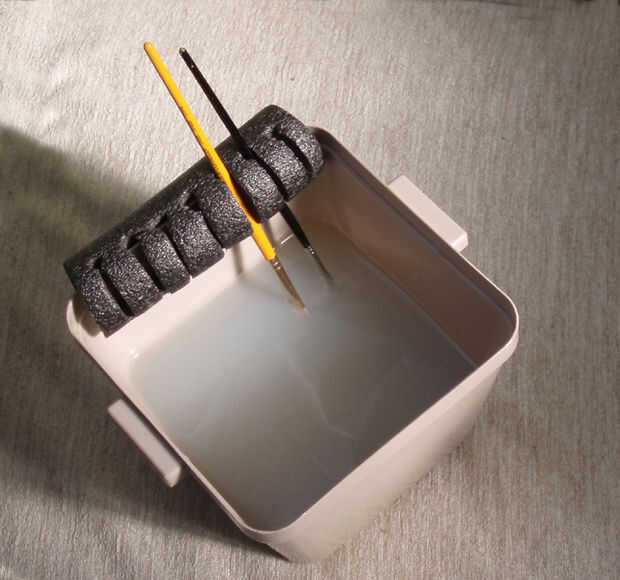 mientras remojar cepillos en agua, pelos de cepillo pueden ser permanentemente distorsionados si presiona contra el fondo del recipiente. Esta idea impide que ese tipo de daños.Pinzas para la ropa Mantenga los cepillos y evitar tocar el fondo del re