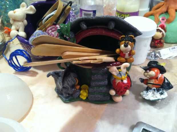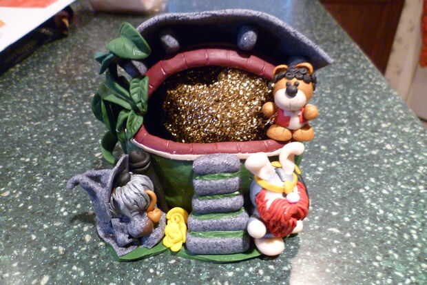 compré una esponja de bronce Hakko de Fry para el uso con mi soldador. Yo no tenía un soporte de esponja durante un tiempo y estaba usando un taza medidora de vidrio pequeños para sostener la esponja de bronce. Así que decidí crear mi propio soporte de esponja de bronce. El primero fue una casa de Hobbit que resultó demasiado grande (fui y adelante y añadidas instrucciones para él). Tuve que usar un pequeño adorno de bola. Después de crear la base, inmediatamente pensé en la cueva en Monty Python y el Grail santo.