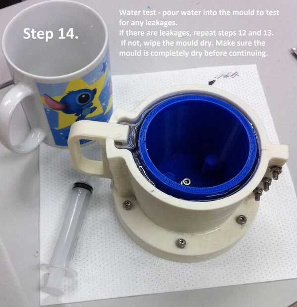 K. esperar 24 horas, o siga las instrucciones en el paquete de la silicona RTV secar. Llene con agua y busque fugas. Si hay fugas, drenar el agua y aplica silicona RTV adicional y deje que se seque. Una vez que el molde esté apretado del agua, proceder.