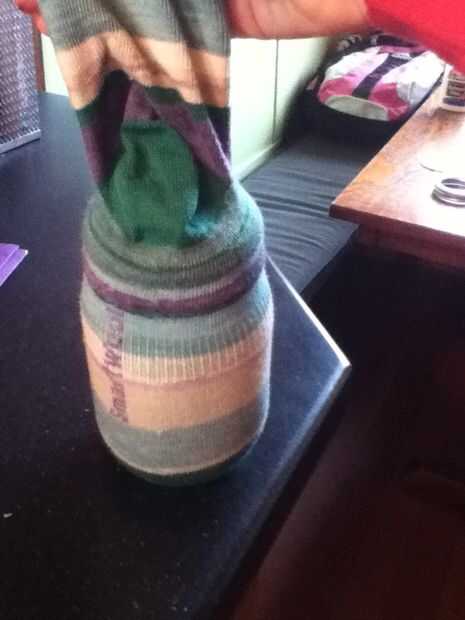 Tomar el tarro de masón, sacar la tapa y luego poner el calcetín sobre él. Ahora tire el superior cuando su calcetín para hacerlo apretado.