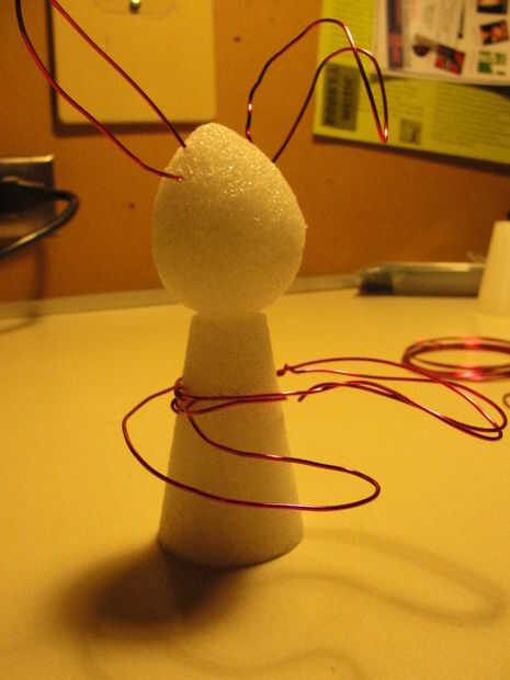 A ser un poco inestable, así que toma pequeños trozos de alambre, dóblelos así que son como pequeñas grapas y asegure el cable en su lugar. Sólo podría quiere sacar ahora y engrape en después de la arcilla está en o deja los brazos en así que usted puede comparar las patas a ellos.