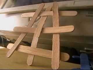 Se debe organizar la primera 'bomba' para darle una simetría de la plaza-como. Mantenerlo verticalmente y luego deslice el medio palo abajo y poco más el palo en la parte inferior. Repita este paso para el palillo en la parte superior de la Plaza (ver Fig. 2). Añadir más palos para hacer un cuadrado sólido para el marco (ver Fig. 4).