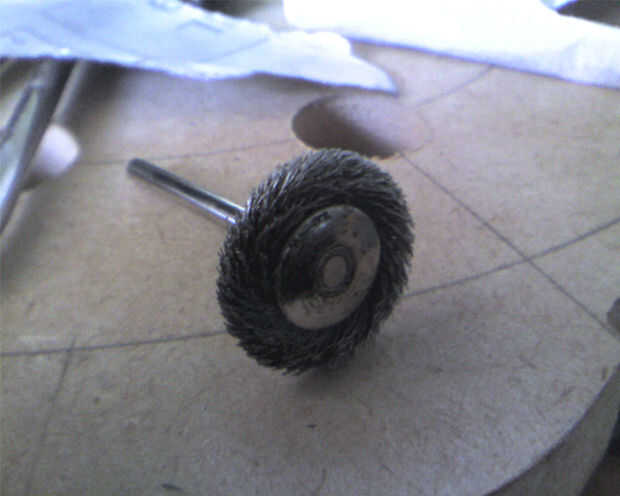 he utilizado la herramienta de pincel de alambre de mi herramienta giratoria para hacer esto. Me dio un acabado áspero pero suave al mismo tiempo. Creo que derretido o Ripeado el aluminio que le da un acabado áspero. Necesitamos una superficie rugosa para que los garabatos en el siguiente paso son más evidentes.