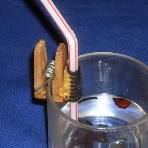 Cuando se pone el pegamento, clip de la clavija de ropa hasta el borde del vaso y correr la paja a través de la tubería.