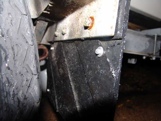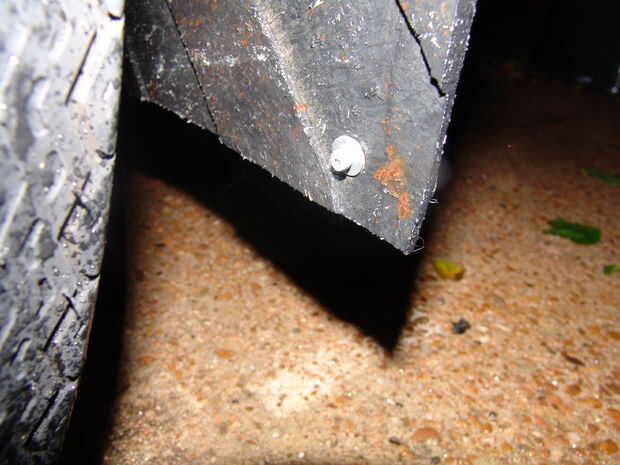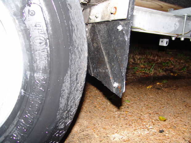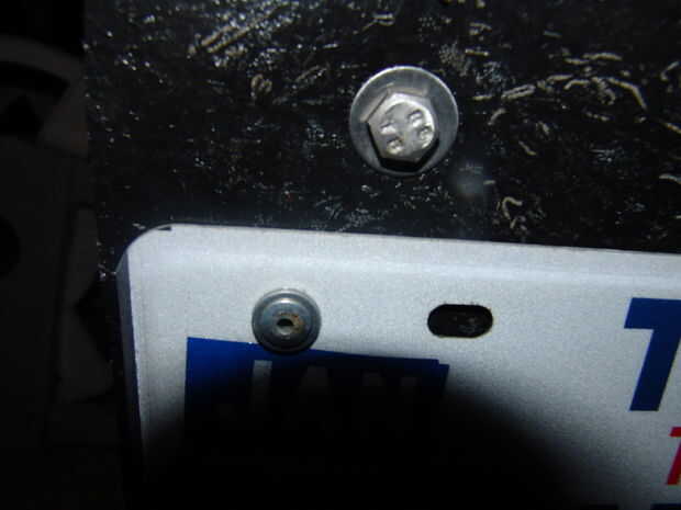 3) perno (o pop remache) el nuevo sostenedor de la placa (anteriormente conocido como una losa de la aleta del fango) al vehículo. Utilicé las arandelas sobre las cabezas de los pernos y las tuercas, así como en ambos extremos de los remaches pop. Hace para una instalación más segura mejor resistente a desgarrar.