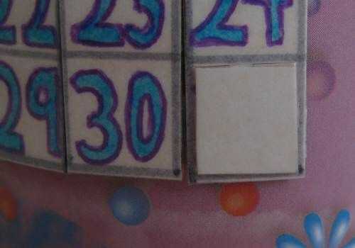 Para todos los meses que tiene solamente 30 días y para febrero que tiene 28 o 29 necesita tres bloqueadores número pequeño. Sólo estos recorte desde el mismo paquete de alimentos y deja en blanco. Una vez más, cubrirlas con cinta adhesiva. Poner un poco de blu tac en la parte posterior de cada uno y pegarlas en el interior de la lata dentro de la llanta hasta que se necesite.
