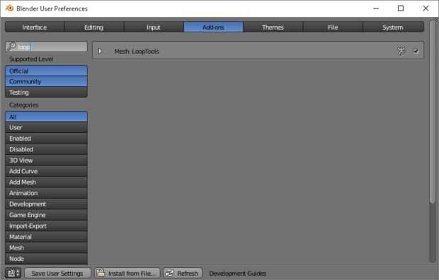- Ahora queremos convertir esas 4 caras en círculos, para hacer que abren el panel de preferencias de usuario, van a Add-ons y buscan LoopTools. Una vez que encuentre el complemento, controlarlo y cerrar la ventana.