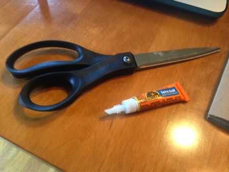 Los suministros que se necesitan para este proyecto es tijeras y alrededor de 2 barras de pegamento loco. Puede que necesite más si su envase es más grande. También es útil tener un pedazo de cartón o de periódico para trabajar para crear menos desorden! Asegúrese de tener cuidado con el pegamento loco porque puede ser muy pegajosa y deja la piel muy áspera. Para ello utilice la menor cantidad de pegamento y ser cuidadoso y paciente. Se utilizarán las tijeras para cortar cuidadosamente las piezas por la mitad.