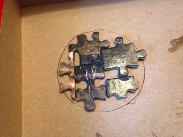 Luego hacer la base de tres piezas del rompecabezas completo. Por consiguiente utilizar cortar pequeñas piezas para hacer una forma que asemeja un círculo. De este modo la base es capaz de soportar la estructura de un envase cilíndrico.