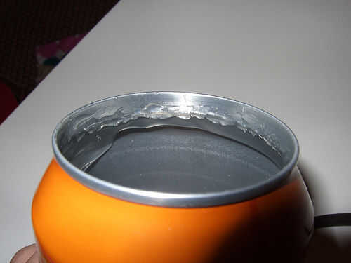 Usé pegamento caliente del derretimiento para sellar el borde de corte de metal para que no le herir a nadie. Una solución similar podría ser pegamento epoxi o con cinta aislante, conducto/pato cinta etc.. Asegúrese de que deja el borde en lo más seguro una manera como sea posible, probablemente mejor que este fuera de alcance de los niños y pequeños animales.