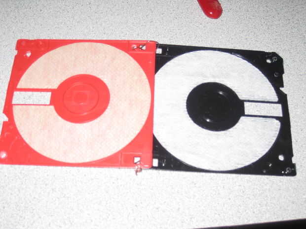 Luego perfore agujeros en las mitades del disquete. Asegúrese de que cualquier cable cabrán a través de los agujeros. Simulacro de uno en cada esquina superior. El disco puede tener algunos agujeros en el lugar correcto ya.