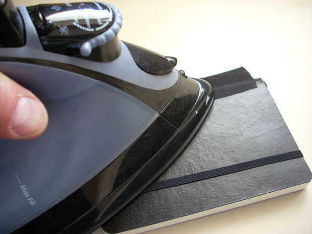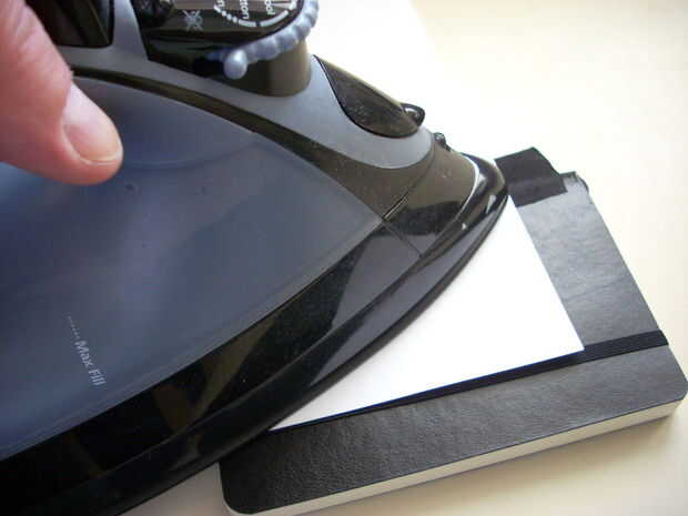 El parche de tela ya cuenta con el pegamento (la razón es en hierro). Calentar la plancha en "algodón" sobre 3-5 minutos. Asegúrese de que tener configurado para seco o sin vapor. Me pareció más fácil de "virar" de un lado y luego envolver mi pluma para obtener un ajuste adecuado y luego virar al otro lado. Una vez que ambos lados son "viró", quitar la pluma y terminar el trabajo. Recomiendo usar un simple trozo de papel entre la plancha y el moleskine (notebook) para evitar que se queme la cubierta del cuaderno. Presione firmemente hacia abajo y mueva la plancha hacia arriba y hacia abajo por el borde en ambos lados durante unos 45 segundos para asegurar una buena adherencia firme.
