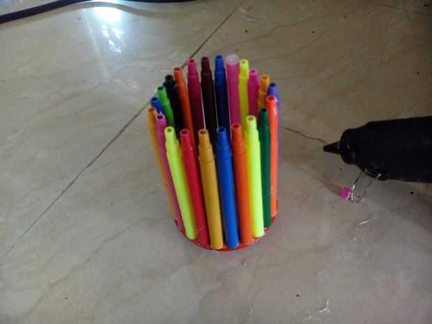 Hola!Este es un instructivo para un sostenedor de la pluma muy fácil.Por favor, ¡ disfruta!Paso 1: Lo que usted necesita: Para este proyecto, necesitarás lo siguiente:+ Un montón de lápices de colores.+ Una pistola de pegamento caliente.+ Una botella