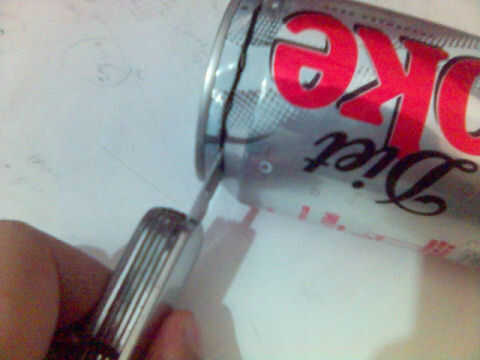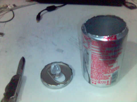 Tomar una lata de soda vacía. Aclarar hacia fuera con agua por lo que elimina cualquier rastro de izquierda de soda en él. Corte la parte superior de la lata con una navaja. Corte en un plano un poco por encima del borde superior (es decir, el punto donde comienza el cilindro). También tenga cuidado de no cortarse al hacerlo. La forma más sencilla de hacerlo es empujar el cuchillo verticalmente en la parte superior con el fin de hacer un agujero. Entonces usando el punto donde el cuchillo se encuentra con la can como una palanca, girar el cuchillo por lo que mantiene en corte más. Tipo de funcionamiento de un abrelatas.