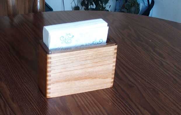 Tenía ya configuración mi enrutamiento jig de 1/4" juntas de caja para otro proyecto, así que ya estaba hecho parcialmente con éste. Me gusta hacer las cosas sin clavos o tornillos por una caja con las articulaciones de la caja es ideal. Más servilleteros sostenga el semi de servilletas apretado como se utilizan, así que pensé en varios sistemas para hacer eso, resortes, etc.. Decidí que usaría el sistema más antiguo, gravedad. Un Consejo simple 1/4" con el borde inferior inglete haría el truco, fuerza mínima y mínima fricción al retirar una servilleta. Puesto que mi mesa era una madera más oscura que lo que normalmente trabajo con, he decidido añadir un borde superior de la nuez de acento.