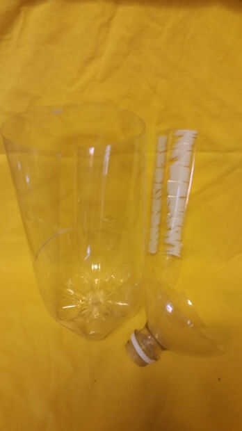Cortar la parte superior de la botella en el estante del armario. Luego corte un 1-1/2" franja vertical, en la base donde el plástico es más grueso. La parte superior del plástico de la corte puede rizar en algo pero no importa una vez que se insertan todas las tapas.