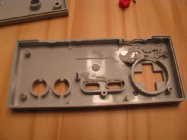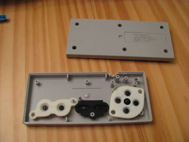 Después de quitar los tornillos de adelante y el controlador NES de la tripa. Qué vas a querer guardar es el A, B botones, la goma de respaldo para la A y B botones. Los botones de selección de inicio. El pad direccional. No necesita el caucho protector de la almohadilla direccional.