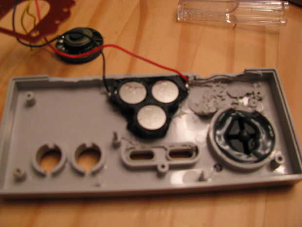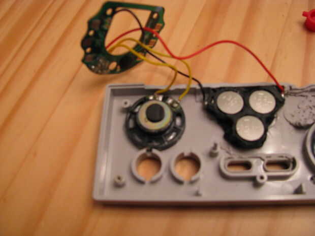 Una vez seco seguir adelante y adhiera el altavoz como se ve abajo. Asegúrese de que hay suficiente espacio para esa pequeña pestaña en el botón A. No la primera vez y tuvo que levantar mi altavoz y moverlo un poco.