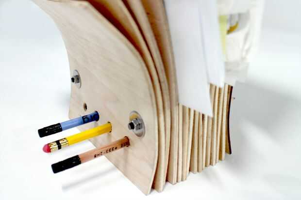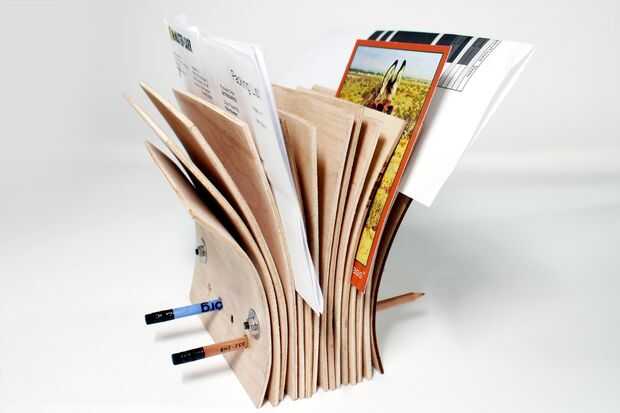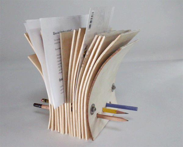 Este organizador de escritorio papel utiliza hojas de madera contrachapada doblada para mantener las cosas en orden. Simple en diseño, las piezas de madera contrachapada curvada recuerdan páginas del libro. La parte inferior del soporte del papel tiene pequeñas aberturas para guardar lápices u otras herramientas pequeñas.