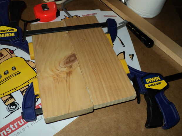 Yo soy pegar dos piezas de madera. Puesto que ya tenía los bordes cuadrados agradables, no había ninguna preparación para el apareamiento los bordes. Ya que no es una pieza estructural que va a llevar mucho peso o tensión, no hay necesidad para reforzar la Unión con espigas o galletas. El pegamento es realmente en algunos casos más de clavos.