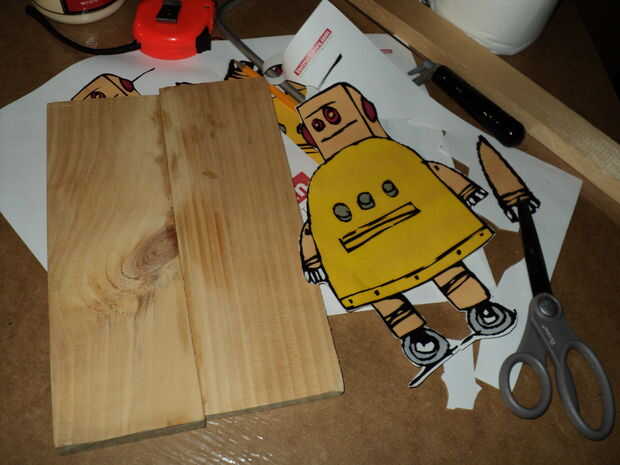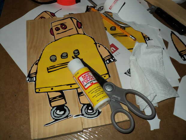 Ahora puede pegar en la imagen del Robot a la madera. He intentado orientar la imagen por lo que reduciría la cantidad de residuos que tendría en recortar la madera alrededor de la imagen. Solía Mod Podge decoupage la imagen en el substrato de madera.