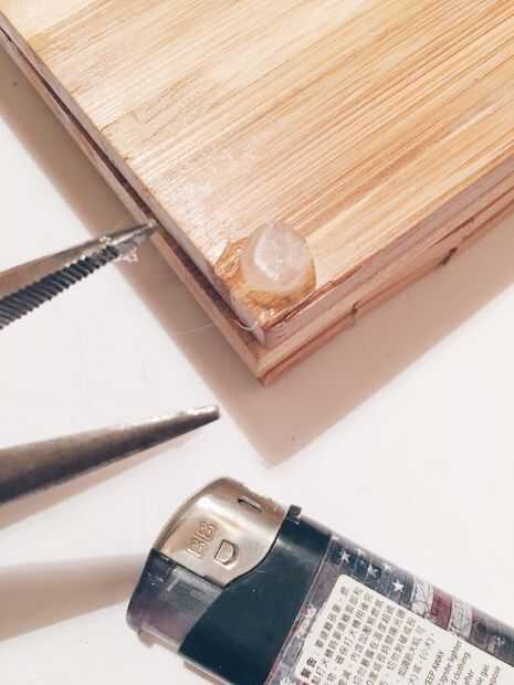Corte 4 pedacitos pequeños con aproximadamente la misma longitud de la barra de pegamento caliente. Utilizar una pinza para mantenerla y el calor de un lado con un mechero. Pegar los trozos de pegamento caliente a la montaña de 5 º, los otros extremos de calor y palillo de la montaña 6 a ellos.