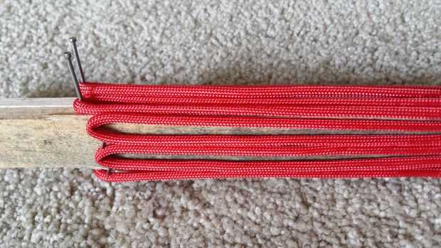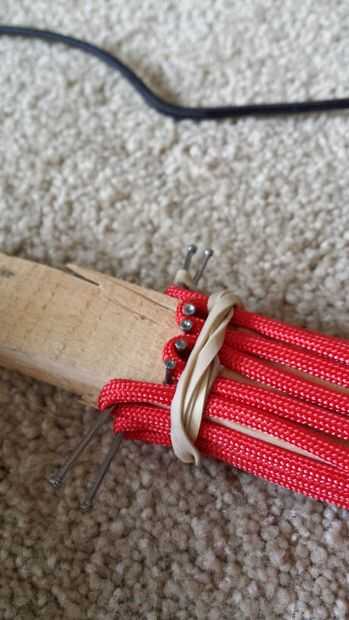 Ahora enrolle el paracord en su plantilla en un bonito tejido en forma de S alrededor de las uñas. Es una excelente Idea para utilizar bandas de caucho para sostener los extremos hacia abajo.