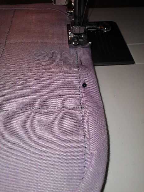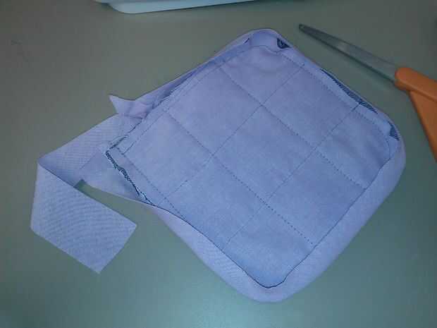 Pin el sesgo ajuste alrededor de los 4 lados de la manopla. Recuerde dejar un extra 5" para el bucle. Coser con costura de 1/3. Sesgo ajuste sobre en la parte posterior de la agarradera, girar a pin y borde. Máquina coser todo el borde del sostenedor de pote incluyendo el extra 5" para la anilla. Doble lazo y puntada hacia abajo.