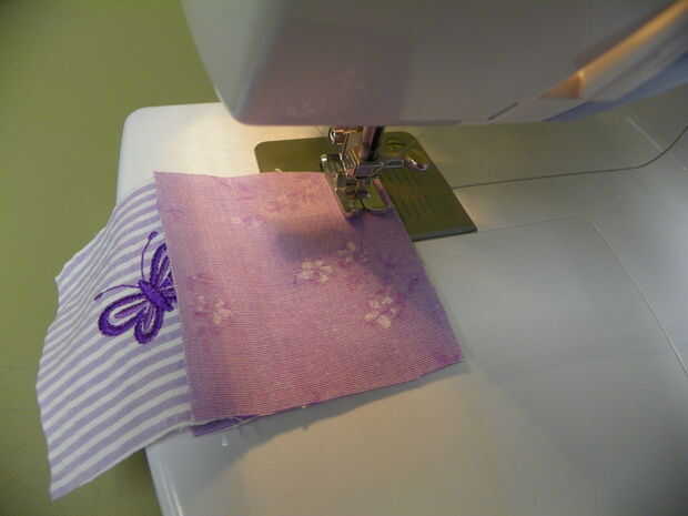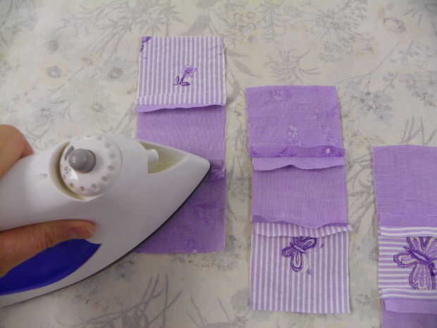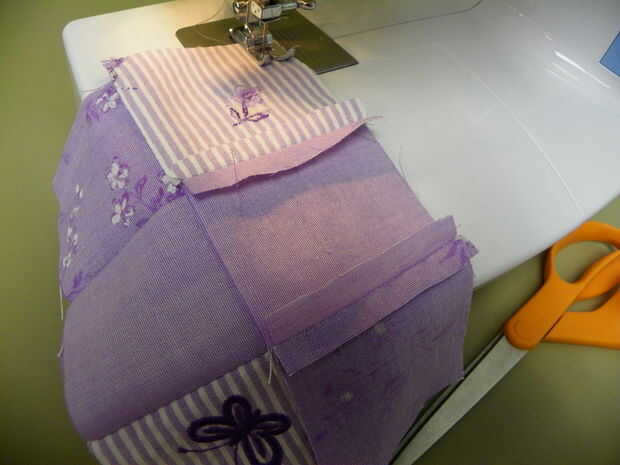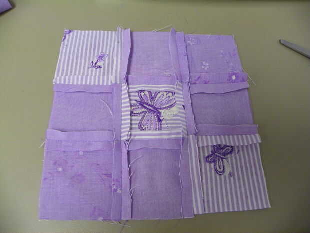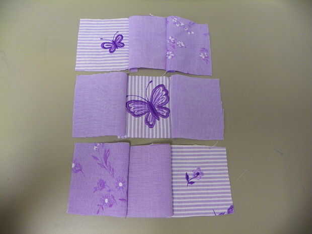 Organizar la 9 plazas cómo quiere. coser 3 cuadrados juntos (margen de 3/8") se trata de la primera fila. Coser juntos las próximas 3 plazas para la segunda fila y luego hacer lo mismo para la tercera fila. Pulse las costuras abiertas. Unir las 3 filas.