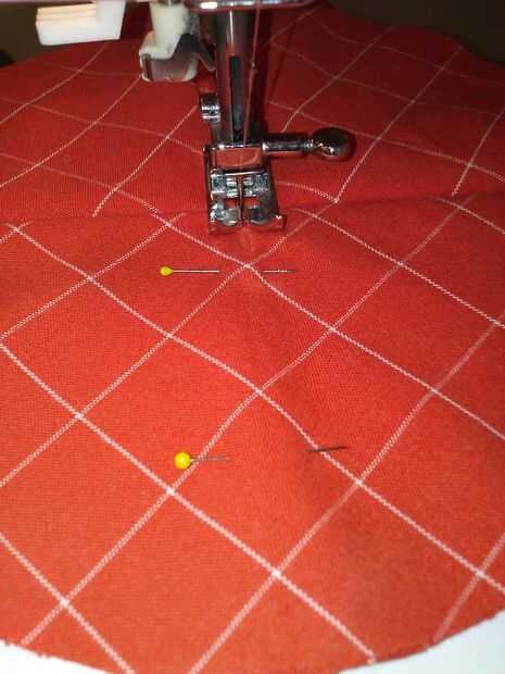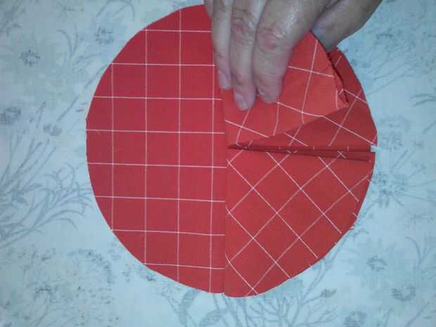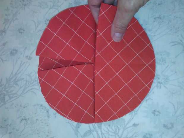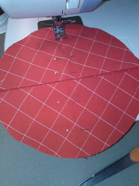 Abrir las 4 piezas sólo se doblan por la mitad. Lugar 2 de estos en el círculo de 7" que no estaba planchado para que los pliegues se reúnen en el centro. PIN. Coser el perpendicular a los pliegues, en el pliegue. Recoger los extremos de los círculos y los otros dos 7" círculos en la parte inferior del círculo alineando los pliegues a lo largo de las costuras de primer lugar.  Coser el centro de estos.
