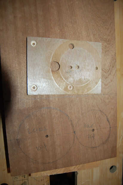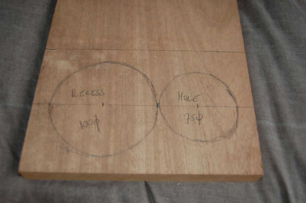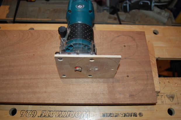Me parece una de las mejores formas de cortar círculos en la madera es utilizar un router. Tengo un pequeño trimmer laminado que he añadido una base de madera contrachapada. En la capa he perforado agujeros en ciertas distancias de la broca de fresadora para darme los agujeros de diferentes tamaños. Después de medir mi botella y stein determinó que necesitaba una cavidad de diámetro 100mm y un orificio de 75mm de diámetro. Ya tenía un agujero en la base de 100mm router así que añadido otro para darme 75mm.