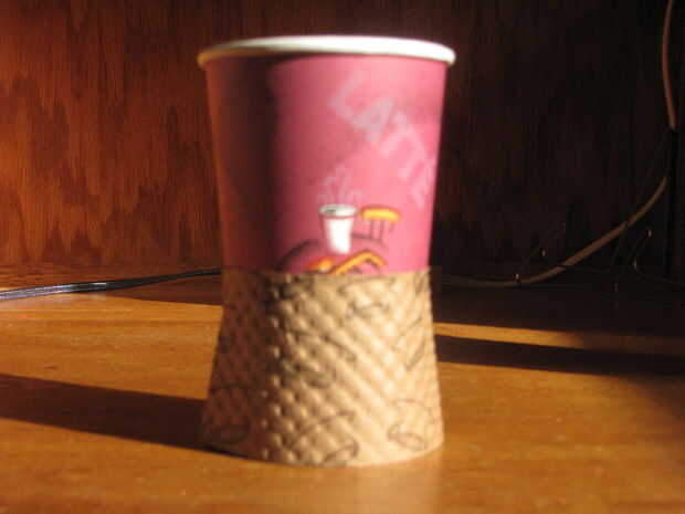 Para ayudar a crear una más amplia y por lo tanto más estable de base, colocar la manga en la taza boca abajo. Vuelta ambas piezas (juntas) y tratar de que poco de pegamento en el espacio entre la Copa y la manga. Déjelo secar.