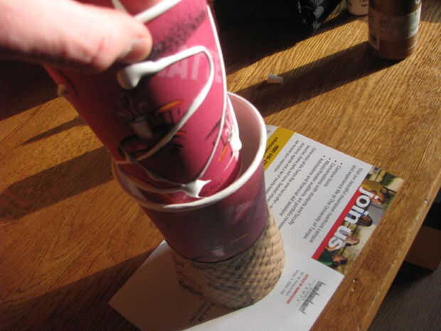 Una vez que haya secado el pegamento sobre los pernos y las arandelas (u otras cosas' pesado'), rociar pegamento por todo el exterior de la taza pequeña y pegarla en la taza grande. Le dan un toque para untar el pegamento alrededor.