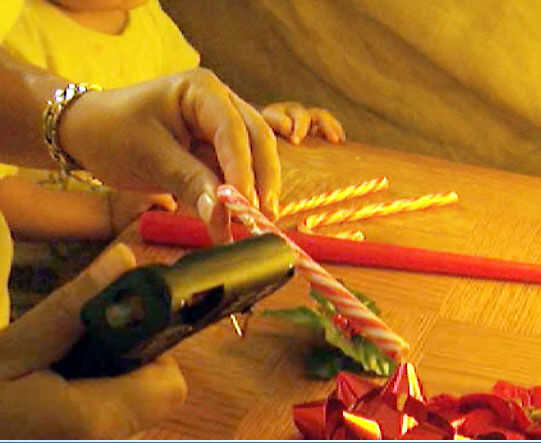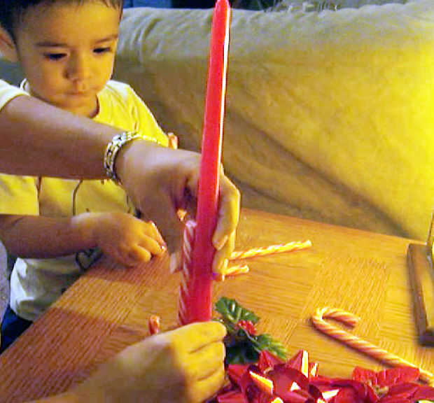 Agregar pegamento a uno de los bastones de caramelo agregar rápidamente a la vela. Presione y mantenga presionado! Asegúrese de que los bastones de caramelo son boca abajo!