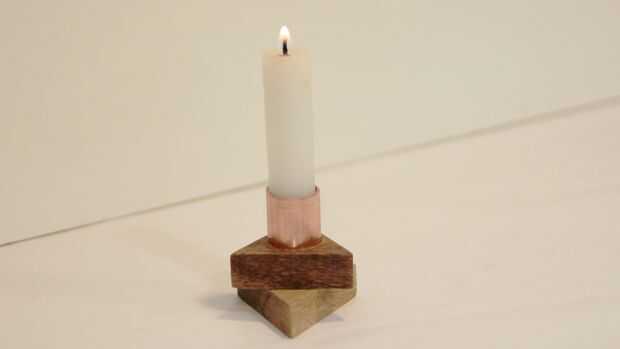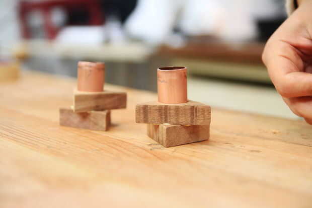 Cortar dos triángulos. Mio mide aproximadamente tres pulgadas en el lado largo y los ángulos estaban a 60 grados, sin embargo puedes hacerlo de todos modos usted quiere. La madera de la arena y luego la tubería de cobre de la arena. Mida 1 1/2 pulgadas en la tubería y cortar con un cortador de tubos.