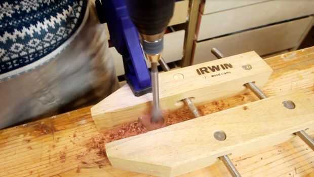 Marque el centro de los triángulos y corte un agujero con el taladro y la espada de 3/4 de pulgada de bits. Gire la pieza sobre la mitad para evitar cualquier arranque.