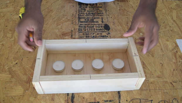 Utilice tornillos o una pistola de pegamento caliente para fijar la madera juntos. Usted puede hacer como grande o pequeño como quieras. He marcado el perímetro de la caja, para establecer una marca de referencia para saber dónde colocar las velas.