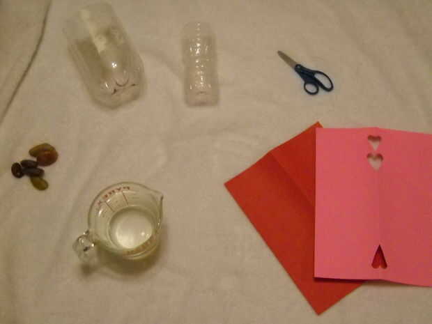 Para este proyecto necesitarás: * Una botella de 2 litros * Una botella de agua de 0,5 litros * Agua * Las rocas * Grueso papel de construcción rosado y rojo * Un congelador * Tijeras * Etiquetas engomadas del corazón (opcionales)