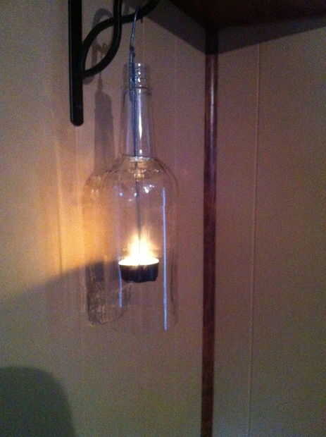 esta es una luz que se me ocurrió colgar encima de mi barra. Utiliza botellas de licor vacías y artefactos de iluminación. Para hacer la 1 luz, necesitará:1 botella de licor vacía (o vino)kit de luminaria de 1 lámpara ($10,97 en HD)1 25 equivalente c
